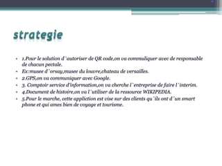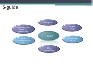 L'application Smart-Guide est un outil de réalité augmentée pour smartphone qui propose des audioguides et permet aux utilisateurs de découvrir des lieux historiques grâce à la localisation GPS et aux QR codes. Elle offre trois modes d'interaction : choix de sujet, localisation par GPS et accès direct via QR codes, tout en fournissant des informations sur l'histoire et des présentations 3D/2D. Un service d'information en ligne est également disponible, bien qu'il soit payant.