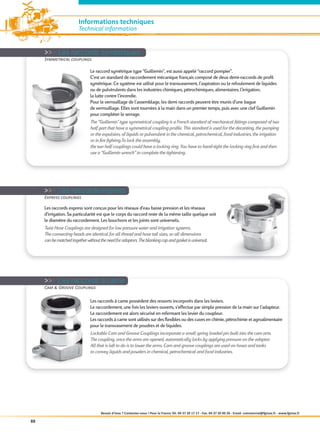 Le document présente une gamme de raccords industriels, notamment des raccords symétriques, express et à came, destinés à divers secteurs comme la chimie, l'agroalimentaire et l'irrigation. Des détails techniques, des prix et des coordonnées pour les commandes sont également fournis. Les produits sont disponibles en acier inoxydable et peuvent être livrés sous 24 heures.