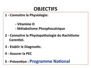 Le document traite du rachitisme carentiel, en expliquant la physiologie, la physiopathologie, le diagnostic et les options de prise en charge. Il souligne l'importance de la vitamine D dans la minéralisation des os et décrit les manifestations cliniques et radiologiques de la maladie. Un programme national de prévention est également mentionné, incluant la supplémentation en vitamine D pour lutter contre cette condition chez les enfants.