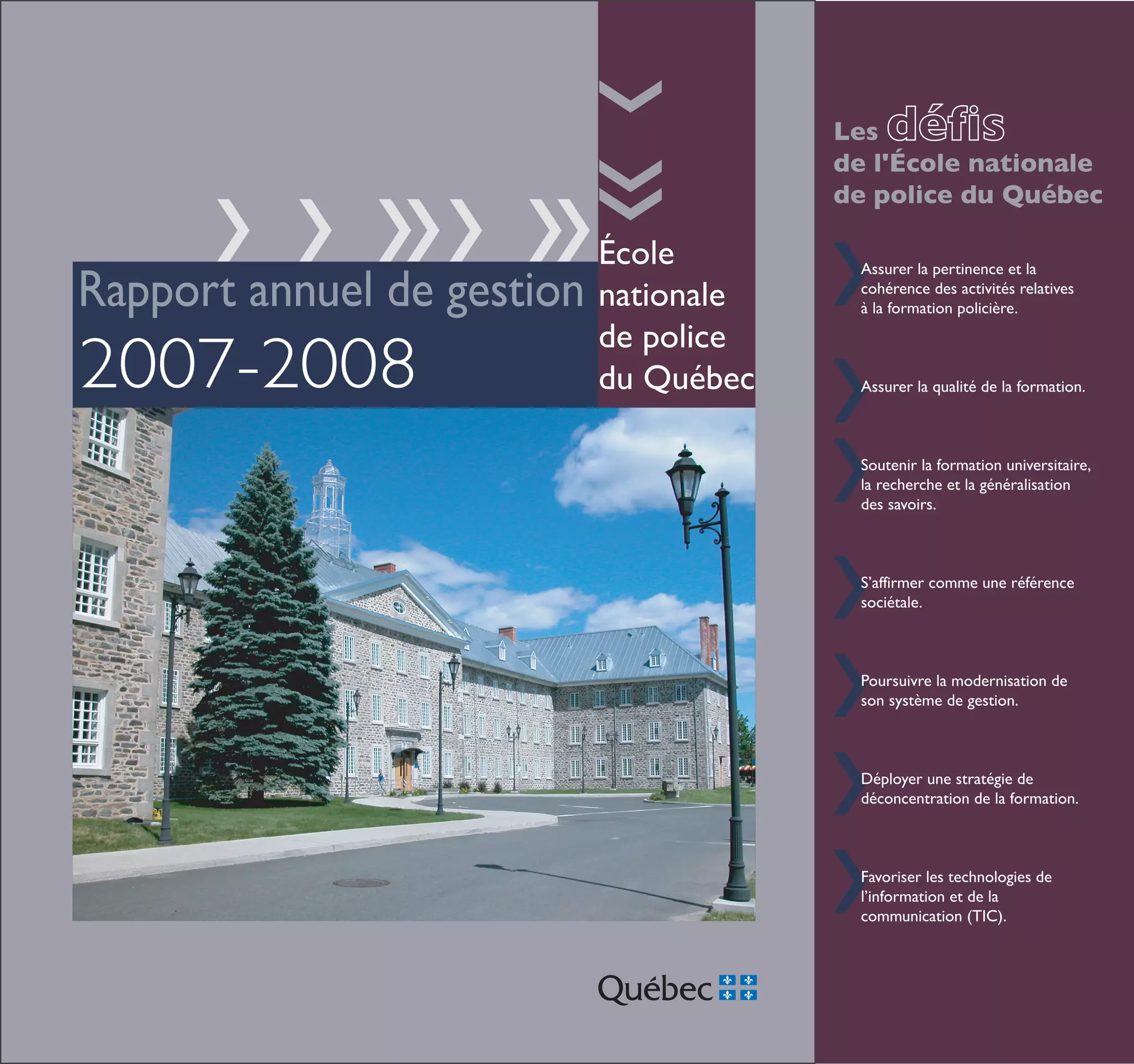 Le rapport annuel de gestion de l'École nationale de police du Québec pour l'exercice financier 2007-2008 présente les résultats obtenus par l'établissement et fait état de sa mission de formation et de perfectionnement des policiers. Il décrit également la gestion des ressources, les états financiers et les progrès réalisés en matière de développement de programmes de formation et d'initiatives de modernisation. Ce document constitue une reddition de comptes envers le gouvernement du Québec et souligne l'engagement de l'équipe dans l'amélioration continue des services offerts.