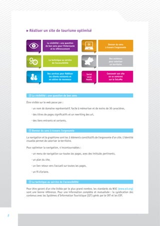 Le document présente des recommandations pour la création d'un site de tourisme optimisé, mettant l'accent sur la visibilité, l'ergonomie et l'accessibilité. Il souligne l'importance d'une navigation fluide, de contenus actualisés et adaptés aux attentes des e-touristes, ainsi que de services pratiques pour fidéliser la clientèle. Enfin, il aborde l'intégration des réseaux sociaux et l'optimisation mobile comme leviers essentiels du marketing touristique.