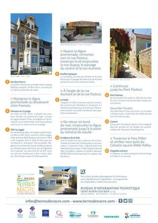 Le document décrit un circuit de 3 km à saint-aubin-sur-mer, mettant en valeur des points historiques tels que l'ancienne gare ferroviaire, des vestiges de la Seconde Guerre mondiale, et l'église néo-gothique. Il mentionne également la falaise du cap romain, riche en fossiles et l'architecture traditionnelle des maisons de pêcheurs. De plus, la promenade en bord de mer propose des vestiges architecturaux et communautaires, comme un ancien marché couvert et des sculptures symbolisant la paix.