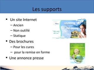 Le document présente une restitution sur la communication des thermes de Cauterets, abordant un site internet ancien ainsi que des brochures relatives aux cures. Il inclut également les conclusions d'une interview ainsi que des forces et faiblesses identifiées. Des extraits et des indicateurs sont fournis pour appuyer l'analyse.