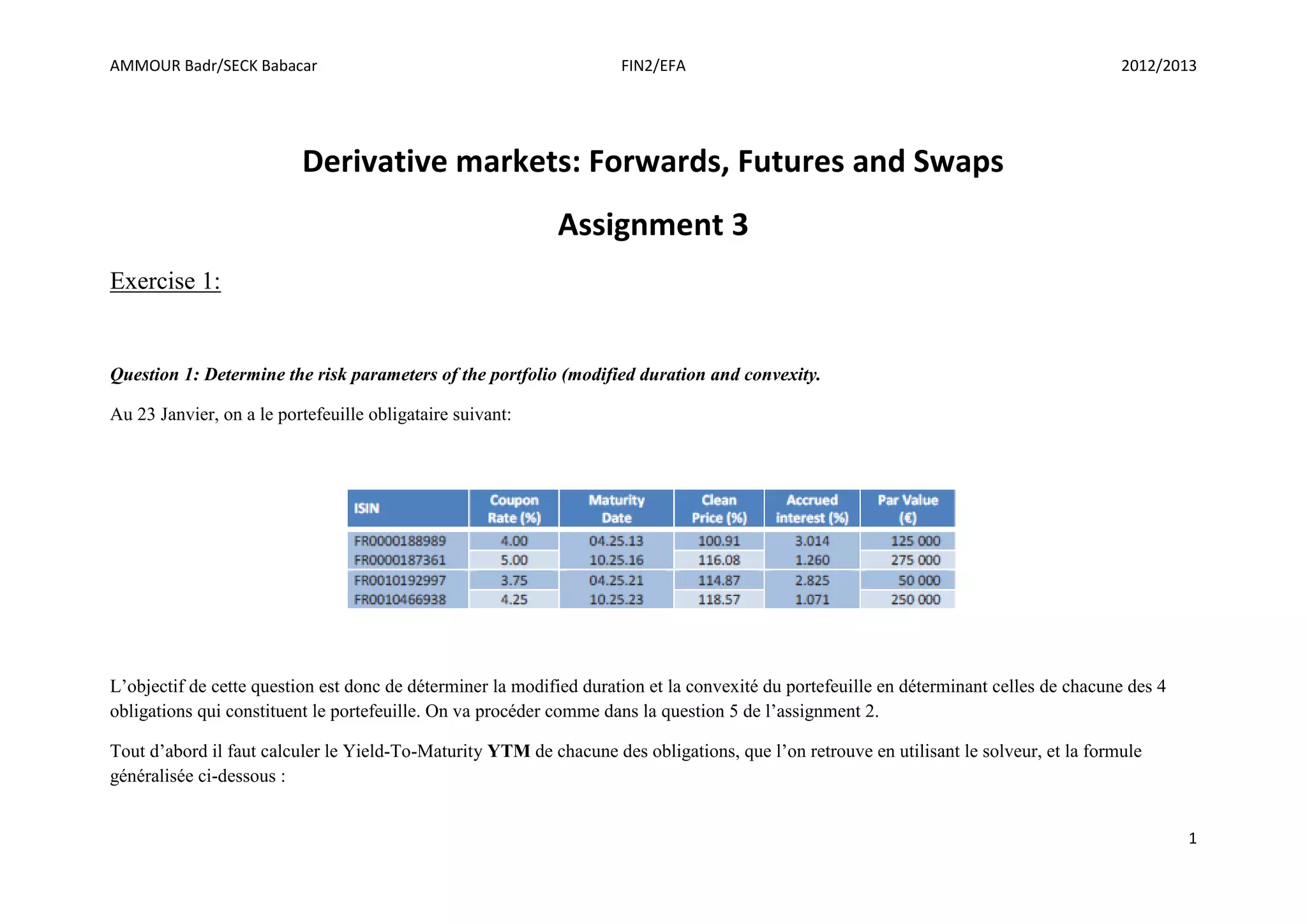 Le document présente une série d'exercices sur la gestion de portefeuille obligataire, où il est question de calculer la duration modifiée et la convexité d'un portefeuille composé de différentes obligations. Il aborde également la dérivation d'une courbe de taux zéro coupon et l'évaluation de swaps, en déterminant les taux fixes qui permettent de ramener le prix des swaps à zéro. Enfin, il discute des stratégies de couverture pour le portefeuille obligataire à l'aide de swaps.