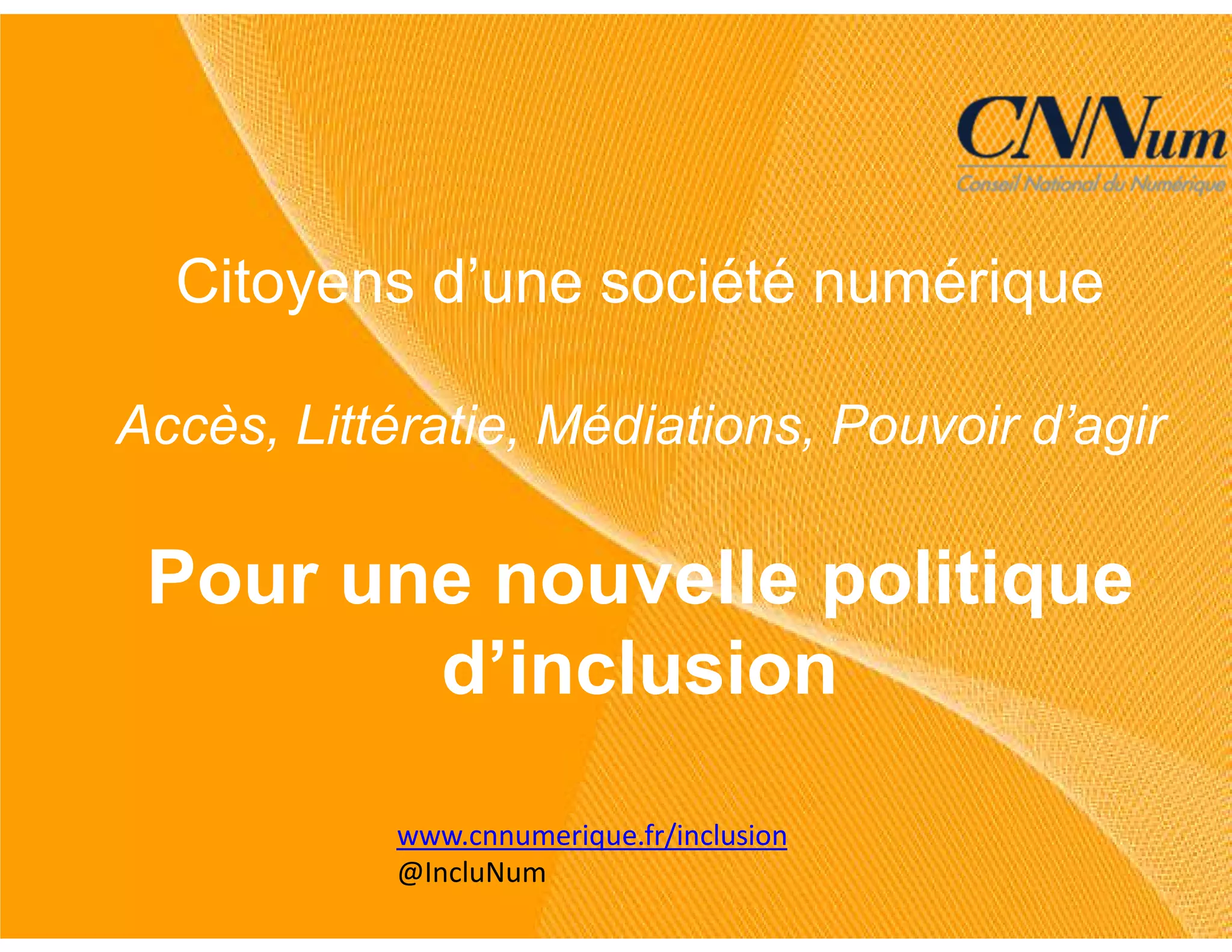 Le document discute des enjeux de l'inclusion numérique, soulignant la nécessité de surmonter la fracture numérique par une stratégie globale impliquant l'accès, la littératie, le pouvoir d'agir et des médiations. Il propose sept recommandations et trente pistes d'action prioritaires, en mettant l'accent sur l'emploi numérique et la formation inclusive des citoyens. De plus, il insiste sur l'importance d'adapter les indicateurs pour mesurer les progrès en matière d'inclusion dans une société de plus en plus numérique.