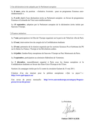 Le rapport d'activité pour 2011 de l'association 'Sauvons l'Europe' met en avant divers événements tels que des assemblées générales, des débats sur des thèmes européens et des initiatives citoyennes. Des pétitions ont été lancées et des partenariats établis autour de l'identité européenne et des révolutions arabes. L'année a également vu des déclarations écrites adoptées par le Parlement européen, ainsi que des engagements en faveur de la campagne pour les États-Unis d'Europe.