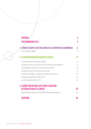 Le rapport d'activité de l'assurance chômage pour l'année 2011 souligne une adaptation continue aux évolutions économiques, marquée par une augmentation des demandeurs d'emploi et un déficit croissant. L'UNEDIC a mis en œuvre des réformes visant à améliorer le service d'indemnisation et à renforcer la gestion paritaire, tout en garantissant la qualité du service rendu par les opérateurs associés. Malgré une instabilité économique, l'UNEDIC s'engage à assurer l'efficacité du système d'assurance chômage au bénéfice des salariés et des entreprises.