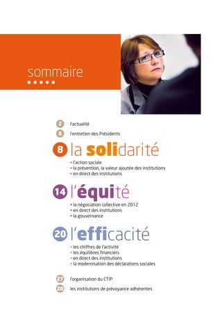Le rapport annuel 2012 du centre technique des institutions de prévoyance (CTIP) présente les actions menées pour défendre et promouvoir les intérêts des institutions de prévoyance, qui couvrent 13 millions de salariés en France. Il souligne également l'importance de la réforme visant à généraliser la couverture complémentaire santé d'ici 2016 et les changements de gouvernance au sein du CTIP. En outre, le rapport met en avant les efforts en matière de solidarité, d'action sociale et de prévention à travers divers programmes et initiatives.
