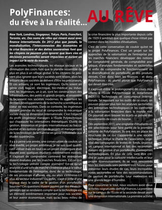 Le rapport présente le projet Polyfinances, initié en 2011 par des étudiants ingénieurs de l'École polytechnique de Montréal pour explorer l'évaluation des entreprises par les marchés financiers. Les étudiants ont créé un fonds d'investissement et ont organisé un campus de printemps à New York, combinant théorie financière et expertise technique afin de comprendre les liens entre technologies et valorisation de marché. Ce projet vise à reconnecter l'économie industrielle et la finance, tout en incorporant des valeurs de développement durable et d'éthique.