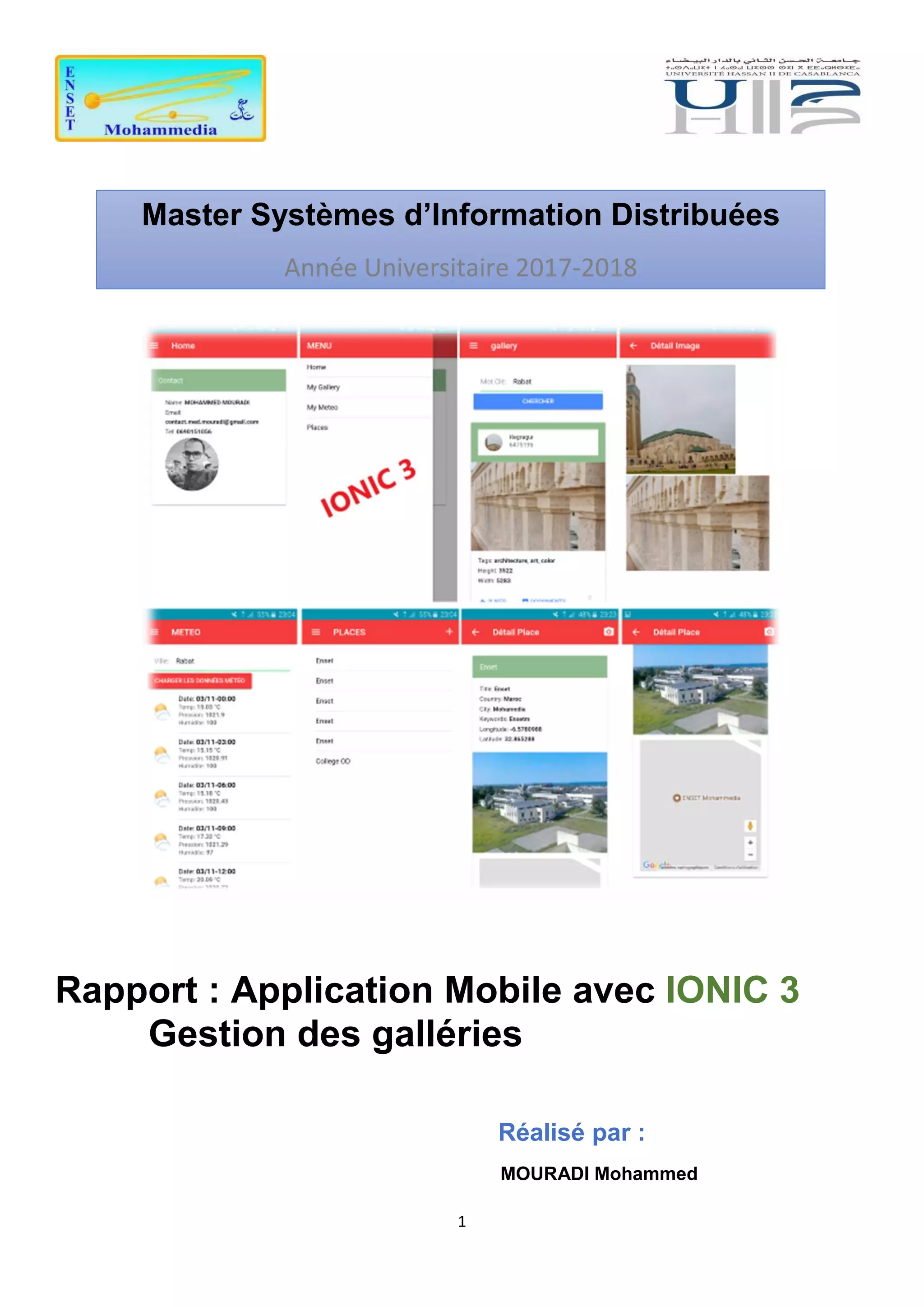 Ce rapport décrit la création d'une application mobile de gestion de galeriiess utilisant Ionic 3, permettant d'ajouter, chercher, supprimer et afficher des lieux avec des photos et informations géographiques. L'application intègre des services pour le stockage local et la recherche d'images via l'API de Pixabay, ainsi qu'une fonctionnalité météo utilisant l'API openweathermap.org. Les instructions comprennent l'installation des dépendances nécessaires et la structure du projet avec plusieurs pages et composants.