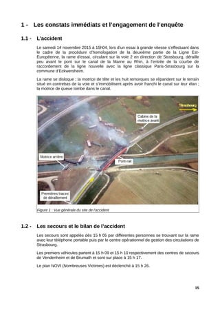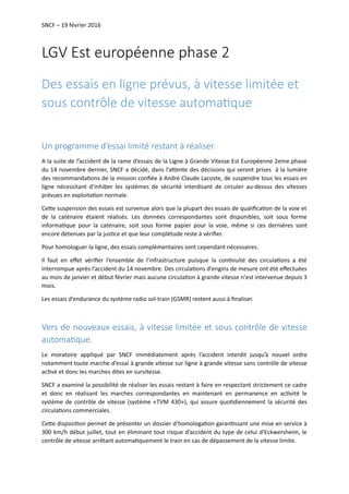 Le rapport présente les résultats d'une enquête technique sur le déraillement d'un TGV lors d'une marche d'essai sur la LGV Est-européenne, survenu le 14 novembre 2015 à Eckwersheim. Il propose plusieurs préconisations techniques et organisationnelles pour améliorer la sécurité des essais ferroviaires, y compris des dispositions pour la surveillance, la gestion des risques, et la formation des conducteurs. Le document vise à renforcer la sécurité et l'efficacité des essais tout en limitant les risques associés.