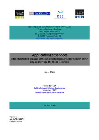 Le document traite des systèmes de communications spatiales et de la réglementation UIT concernant l'accès à l'orbite et aux fréquences pour développer une offre DTH en Europe. Il détaille les articles régissant la coordination, la notification, et l'identification des satellites en présence, accompagnés d'analyses d'interférences pour optimiser la couverture. L'objectif est de classer les solutions disponibles en fonction des dispositions réglementaires et des paramètres techniques pertinents.