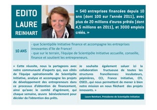 En 2011, Scientipôle Initiative a financé 100 entreprises innovantes en Île-de-France, portant à 540 le nombre total d'entreprises soutenues en 10 ans, avec plus de 20 millions d'euros prêtés. L'organisation offre des prêts d'honneur sans garantie, accompagnés d'une expertise pour aider les entrepreneurs à développer leurs projets. Les chiffres montrent une activité soutenue, avec un fort taux de maintien d'activité des entreprises financées et des partenariats renforcés pour optimiser leur accompagnement.