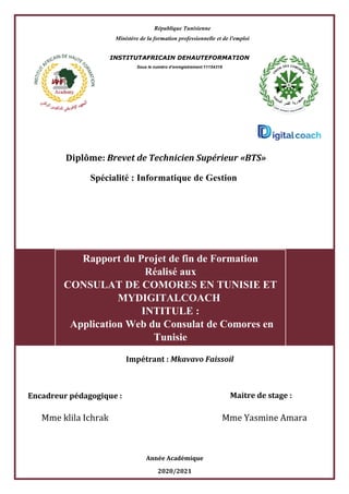 Le rapport présente le projet de fin de formation d'une application web pour le consulat des Comores en Tunisie, visant à améliorer la gestion des ressortissants comoriens sur le sol tunisien et à faciliter les démarches administratives. Il détaille la méthodologie adoptée, la modélisation, ainsi que les fonctionnalités proposées, notamment le recensement et la demande de documents consulaires. Le projet est réalisé sous la supervision de Mme Klila Ichrak et Mme Yasmine Amara dans le cadre d'un stage à MyDigitalCoach.