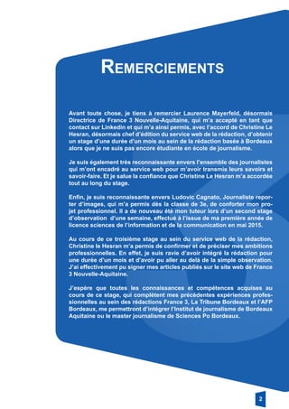 Le rapport de stage de Robin Caroline à France 3 Aquitaine présente son expérience d'un mois au sein du service web, où elle a pu rédiger et signer des articles pour le site internet de la chaîne. Elle y explore le fonctionnement de la rédaction, les tâches des journalistes et son intérêt pour le journalisme, tout en exprimant sa volonté d'intégrer une école de journalisme. Cette immersion lui a permis de renforcer ses compétences et de clarifier ses ambitions professionnelles dans le domaine du journalisme.
