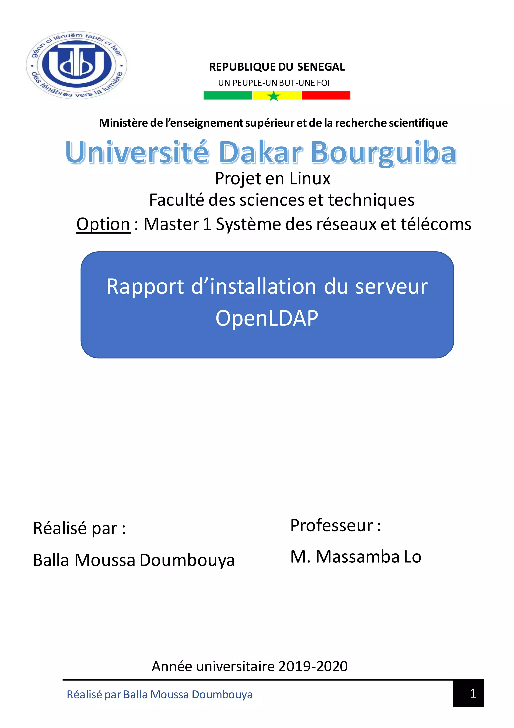 Ce document présente un rapport sur l'installation et la configuration d'un serveur OpenLDAP sur Ubuntu 18.04, comprenant des étapes détaillées sur la mise en place, la reconfiguration et la gestion d'entrées LDAP. Il aborde également l'authentification centralisée via LDAP pour les clients Linux et Windows, ainsi que les outils nécessaires pour interagir avec le serveur. En conclusion, le projet met en avant les compétences acquises concernant la gestion de l'annuaire LDAP et le paramétrage des clients pour une authentification sécurisée.
