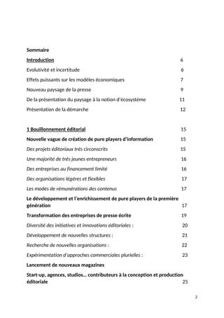 Le rapport explore la transformation des modèles économiques de la presse écrite sous l'impact du numérique, soulignant la montée des pure players et les défis liés à la monétisation de l'information. Il met en évidence une évolution vers un écosystème horizontal où la circulation de l'information se fait par le biais de nouveaux acteurs et intermédiaires, redéfinissant ainsi la relation entre médias et publics. Enfin, des recommandations sont faites pour accompagner cette mutation, notamment en termes d'innovation, de financement et de formation des journalistes.