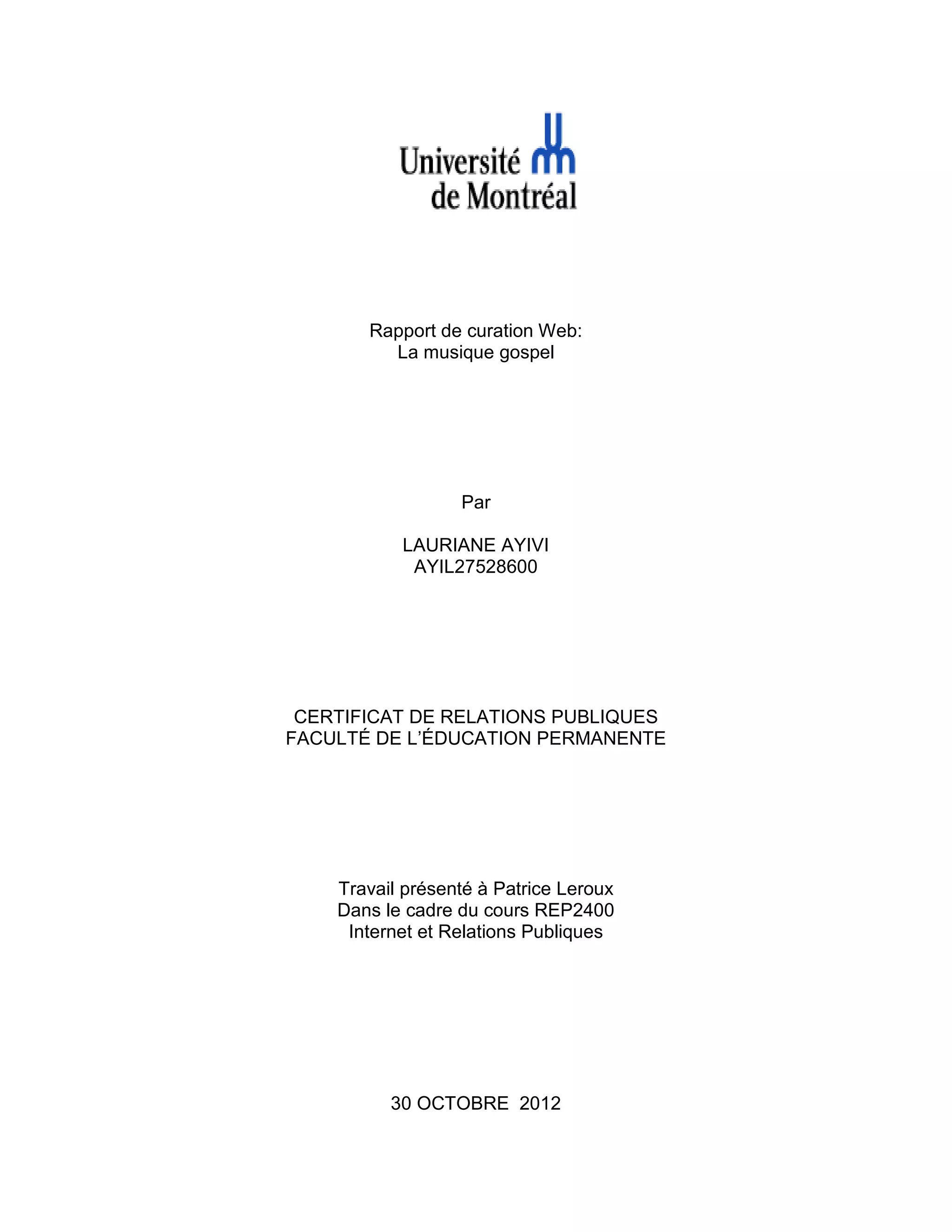 Le rapport analyse la musique gospel, soulignant son évolution depuis les negro spirituals et son intégration avec d'autres genres musicaux modernes. Il met en avant la disparité de ressources en anglais par rapport au français et présente une liste de sites et artistes influents dans le domaine du gospel. En conclusion, le document souligne la richesse des ressources disponibles en ligne sur la musique gospel, malgré des variations en pertinence et en contenu.