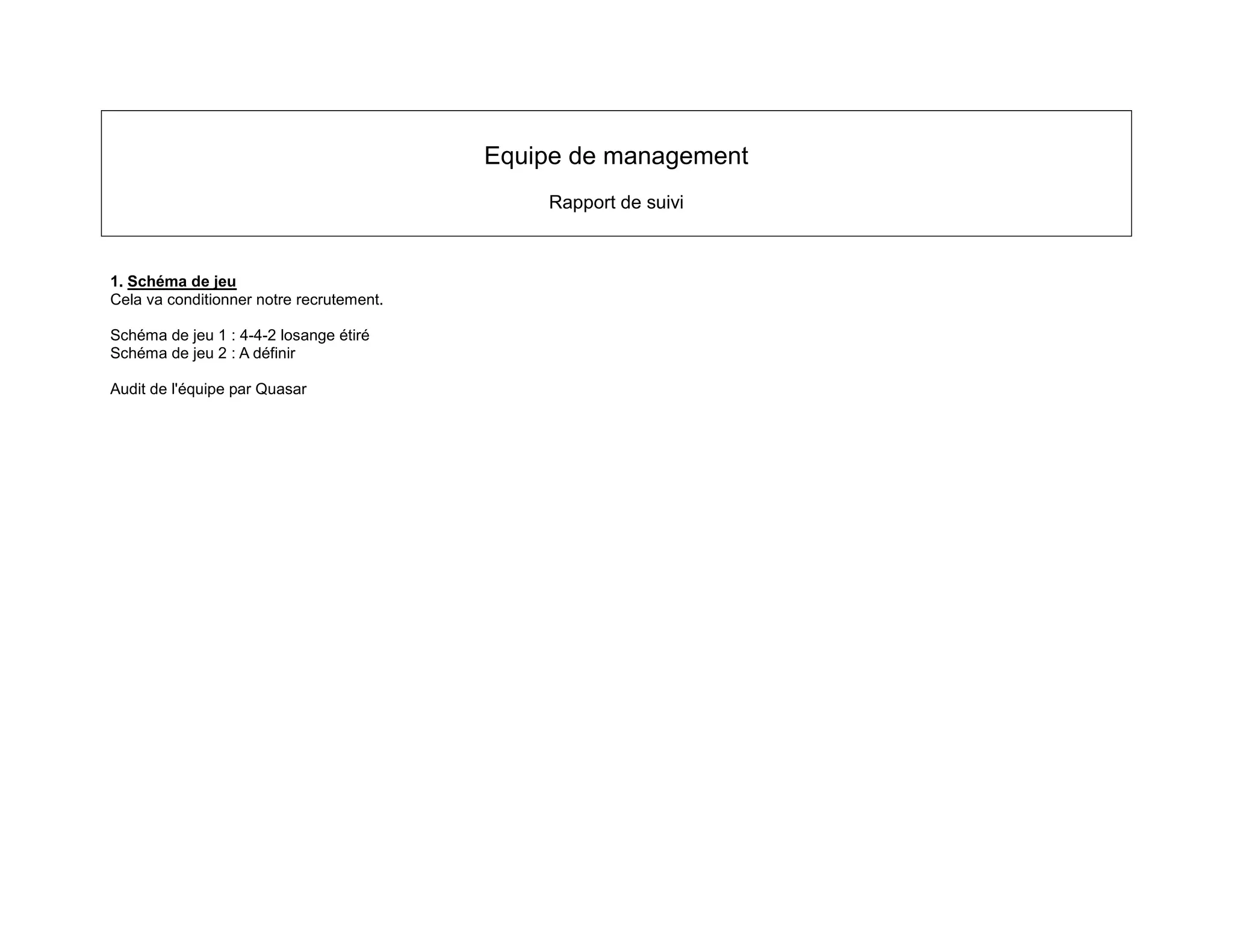 Le rapport de suivi de l'équipe de management met en évidence des problèmes de placement des joueurs et un manque d'implication, avec un objectif de bilan de l'effectif et de potentiels recadrages nécessaires. Il détaille également un schéma de recrutement, précisant les postes ouverts et les critères de sélection des nouveaux joueurs. De plus, le rapport aborde des initiatives pour améliorer la communication et l'engagement au sein du club, ainsi que des projets de montage vidéo pour promouvoir l'équipe.