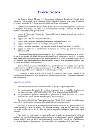 Le rapport de Bruno Mettling examine l'impact de la transformation numérique sur le travail, soulignant les effets sur les conditions de travail, l'organisation du travail et le management. Il met en lumière la nécessité d'adapter le cadre juridique et de développer de nouvelles compétences pour faire face aux évolutions rapides induites par le numérique. Le document énonce également 36 préconisations pour réussir cette transformation en entreprise, en favorisant un climat de dialogue et d'écoute entre les acteurs concernés.