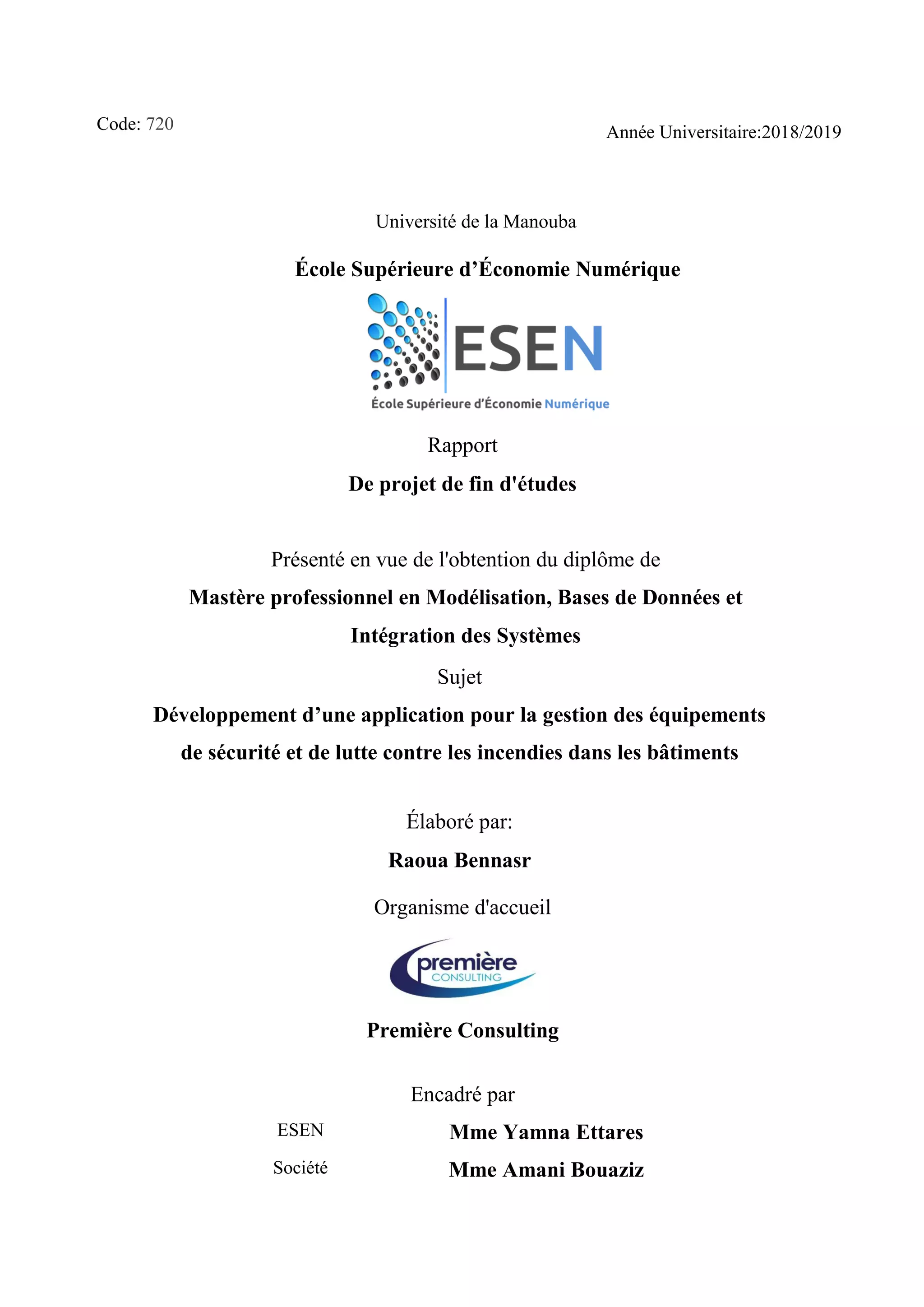 Ce document présente un rapport de projet de fin d'études sur le développement d'une application pour la gestion des équipements de sécurité et de lutte contre les incendies dans les bâtiments, réalisé par Raoua Bennasr. Il inclut une étude approfondie du projet, la méthodologie agile adoptée (Scrum), les phases de planification et de développement, ainsi que des spécifications fonctionnelles détaillées. Le travail a été encadré par des professionnels et vise à répondre à des besoins spécifiques dans un contexte organisationnel.