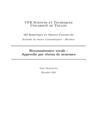 Ce rapport de projet explore l'apprentissage par réseaux de neurones dans le cadre de la reconnaissance vocale pour détecter les émotions humaines. Il décrit la méthodologie de traitement des données, l'architecture des réseaux de neurones et les résultats obtenus dans la classification des émotions, tout en réfléchissant aux implications de cette technologie. Le projet vise à permettre à un robot d'adapter son comportement en fonction de l'état émotionnel de l'utilisateur.