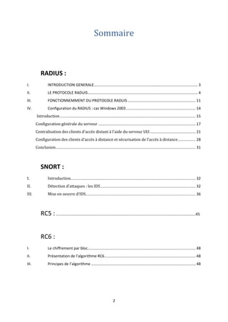 Le document présente une étude sur le protocole RADIUS, incluant son fonctionnement, ses méthodes d'authentification et ses applications dans la sécurisation des réseaux. Il aborde également des sujets comme la détection d'attaques avec Snort et les algorithmes de chiffrement RC5 et RC6. L'accent est mis sur les mécanismes d'autorisation et de comptabilisation, soulignant l'importance de la gestion des accès réseau pour garantir la sécurité.