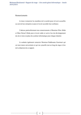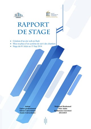 Le rapport de stage de Mohamed Bouhamed présente son expérience au sein de la société Aicha de Bâtiment, où il a développé un site web en Flash et mis en place un système de suivi des chantiers. Il décrit les objectifs, les outils utilisés et les résultats obtenus, ainsi que les enseignements tirés de cette première année de génie informatique. Le rapport comprend également des remerciements, une présentation de l'entreprise et un bilan professionnel et personnel.