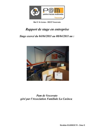 Le rapport décrit un stage de 5 jours au point d'accès multimédia (pam) de Vescovato, géré par l'association familiale La Casinca, où l'auteur a observé le fonctionnement et aidé lors des ateliers pour différents publics. Il a collaboré avec des élèves pour leur préparation au B2i primaire et assisté l'animatrice TIC dans ses diverses activités. Le pam offre un espace numérique équipé et ouvert à tous, encourageant l'autonomie des usagers grâce à des ateliers adaptés aux besoins des participants.