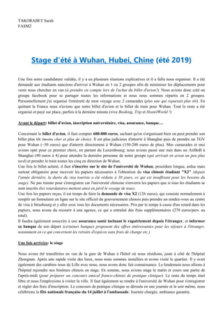 L'étudiant a participé à un stage d'été à Wuhan, en Chine, en 2019, organisant son voyage avec d'autres camarades et gérant divers aspects tels que le visa, l'assurance et les déplacements. Une fois sur place, le stage se déroulait le matin et des visites de la ville étaient faites l'après-midi, avec un itinéraire comprenant des lieux emblématiques tels que Zhangjiajie et Xi'an, avant de modifier les plans en raison des manifestations à Hong Kong. L'expérience, bien que parsemée d'imprévus, a été jugée enrichissante et conseillée pour les futurs étudiants.