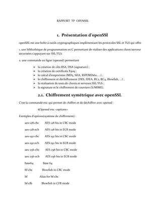 Le document présente une synthèse d'OpenSSL, une boîte à outils cryptographiques pour sécuriser les communications via SSL/TLS. Il couvre des fonctionnalités telles que le chiffrement symétrique, la génération de clés RSA, la signature de documents et la création de certificats SSL auto-signés. Des exemples de commandes pour chiffrer, déchiffrer et signer des fichiers avec OpenSSL sont également fournis.