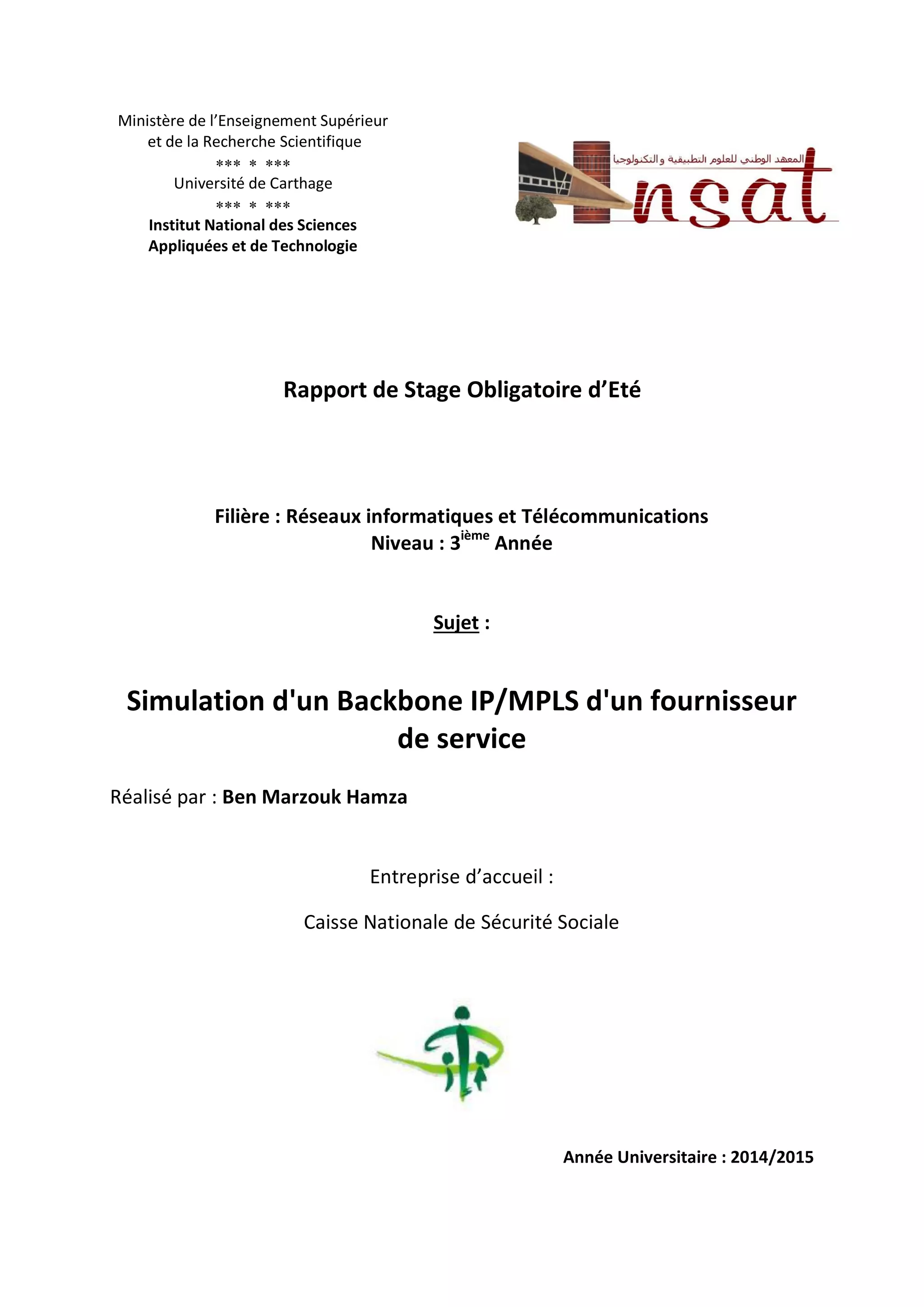 Ce rapport de stage présente la simulation d'un backbone IP/MPLS pour la Caisse Nationale de Sécurité Sociale, réalisée par Hamza Ben Marzouk dans le cadre de sa troisième année à l'Université de Carthage. Le projet vise à améliorer la gestion des réseaux de communication en tenant compte de la qualité de service (QoS) tout en réduisant les coûts. Les outils utilisés incluent GNS3 pour modéliser le réseau, et les technologies MPLS et OSPF pour optimiser le routage et la performance des échanges de données.
