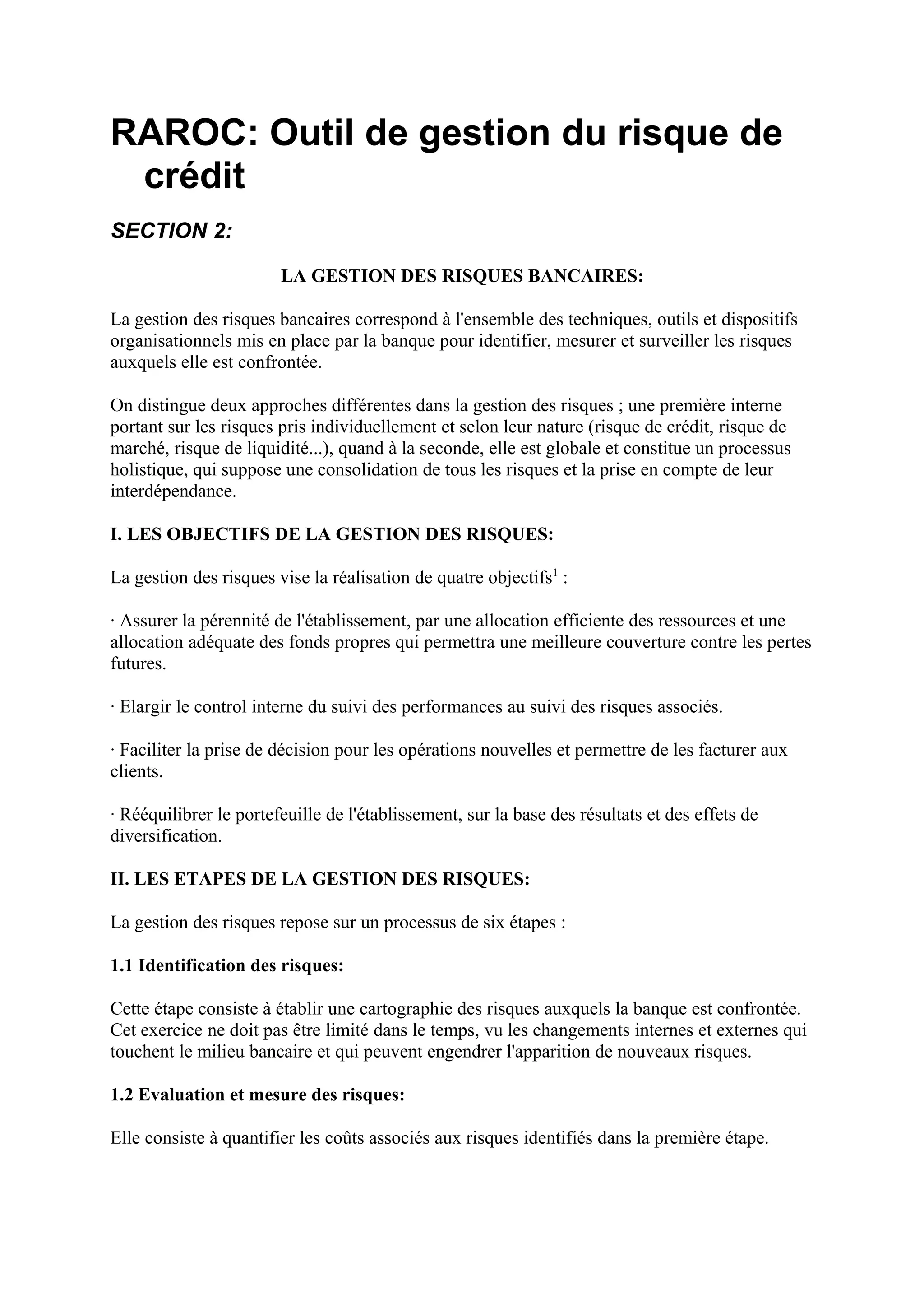 Le document traite de la gestion des risques bancaires, en détaillant les techniques d'identification, mesure et surveillance des risques, ainsi que les objectifs et étapes associés à cette gestion. Il aborde également la réglementation prudentielle internationale et l'évolution des accords de Bâle, illustrant les limitations de Bâle I et la nécessité d'avancer vers Bâle II, qui offre une approche plus différenciée et adaptée aux divers risques bancaires. Enfin, le texte souligne les méthodes de calcul des exigences en fonds propres selon les différents types de risques, y compris les approches standardisées et basées sur les notations internes.