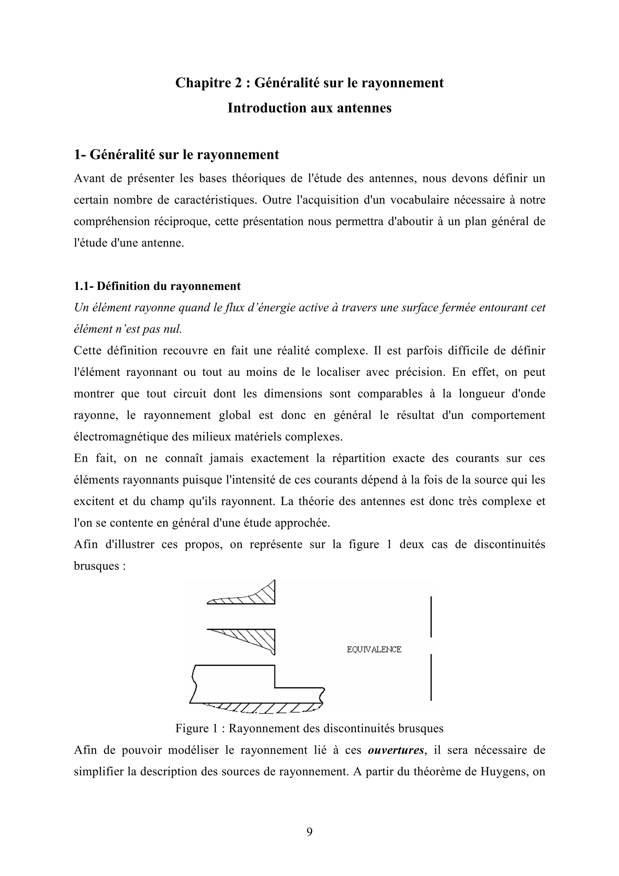 Ce document présente des généralités sur le rayonnement et les antennes, en définissant des concepts clés tels que le rayonnement, les antennes, et le théorème de réciprocité. Il souligne l'importance des paramètres caractéristiques des antennes, tels que la directivité et le gain, ainsi que la nature complexe des éléments rayonnants. Enfin, il aborde des aspects pratiques comme les bandes d'utilisation et la température de bruit des antennes.