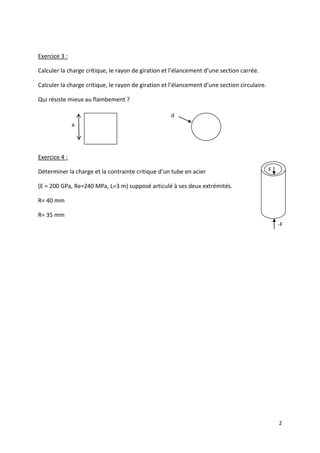 Le document propose une série d'exercices sur la résistance des matériaux, notamment le calcul des contraintes et des torseurs pour des poutres soumises à des charges. Il traite également de l'analyse de flambement et de la détermination des caractéristiques d'élancement de sections rectangulaires et circulaires. Enfin, il aborde la charge critique et la contrainte d'un tube en acier en fonction de ses dimensions et propriétés mécaniques.