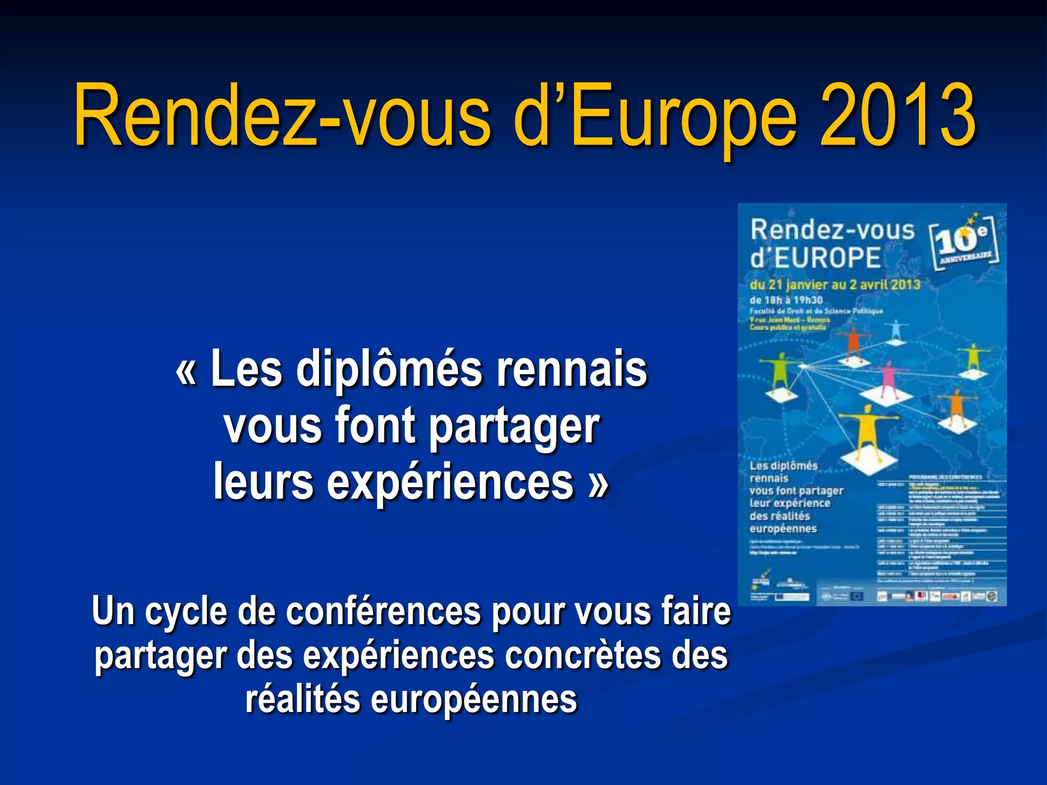 Les Rendez-vous d'Europe 2013 sont un cycle de conférences à Rennes, présentant des expériences concrètes liées à l'Union européenne, abordant divers thèmes comme les financements, la politique de la pêche et la protection des consommateurs. Organisé par le Centre d'excellence Jean Monnet et l'association Europe Rennes 35, cet événement encourage la participation citoyenne et promeut la compréhension de l'intégration européenne. Pierre angulaire de cette initiative, le Centre d'excellence Jean Monnet rassemble des experts académiques et des acteurs de la société civile pour une réflexion interdisciplinaire sur l'Europe.