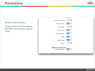 Le document fournit un guide sur l'utilisation de la fonction webcast sur libcast.com, détaillant les étapes nécessaires pour créer, modifier et publier un webcast. Il explique également les options d'édition et les paramètres de publication, ainsi que des conseils pratiques pour tester le contenu généré. Enfin, il mentionne les évolutions futures des outils et des fonctionnalités disponibles.