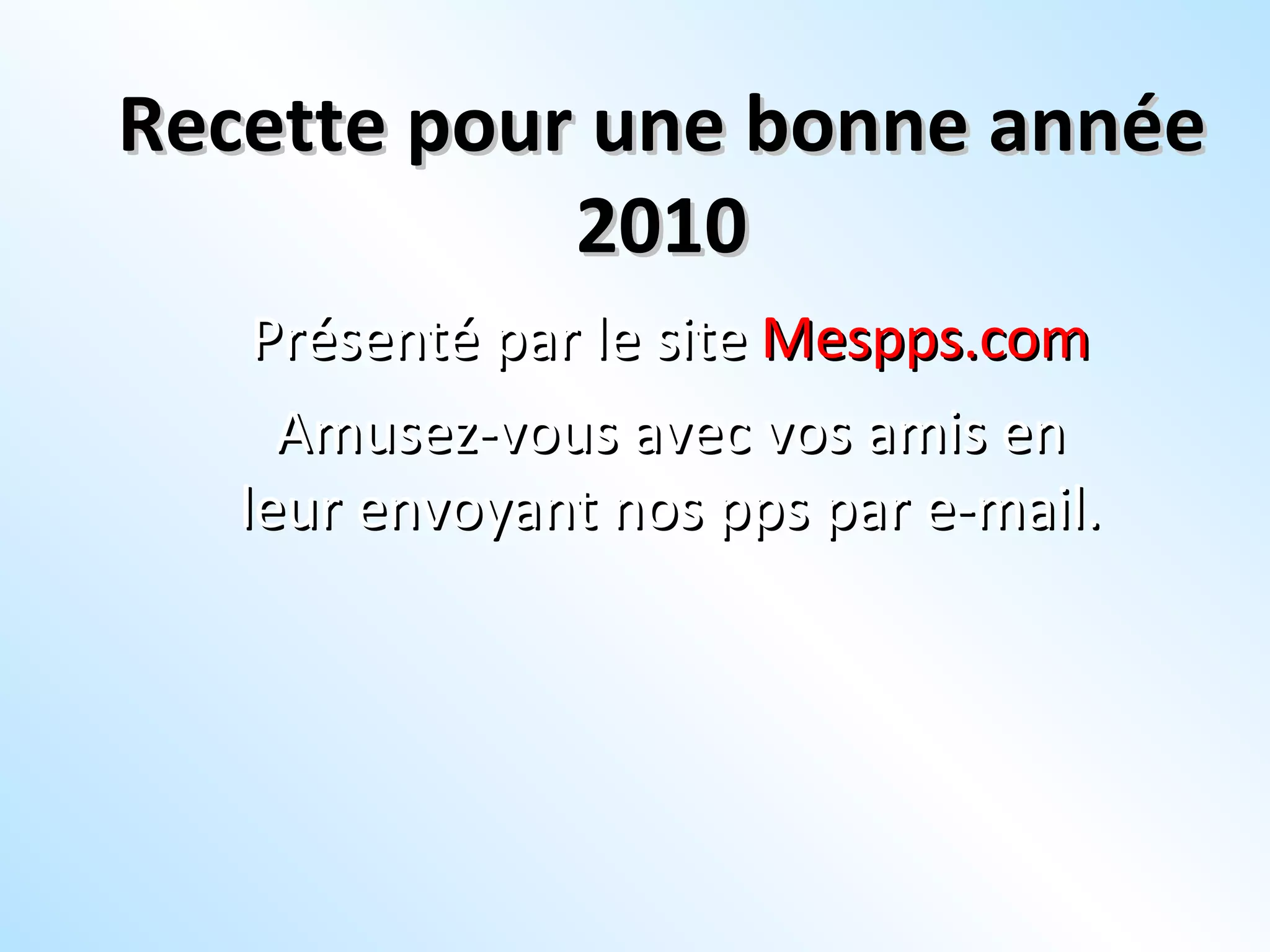Le document présente une recette symbolique pour passer une bonne année 2010, invitant à intégrer des valeurs positives dans chaque jour. Il suggère de se débarrasser des sentiments négatifs et d'ajouter des ingrédients tels que la patience, le courage, et l'espoir. La recette culminerait dans un grand bol d'amour, prêt à être partagé avec tendresse.