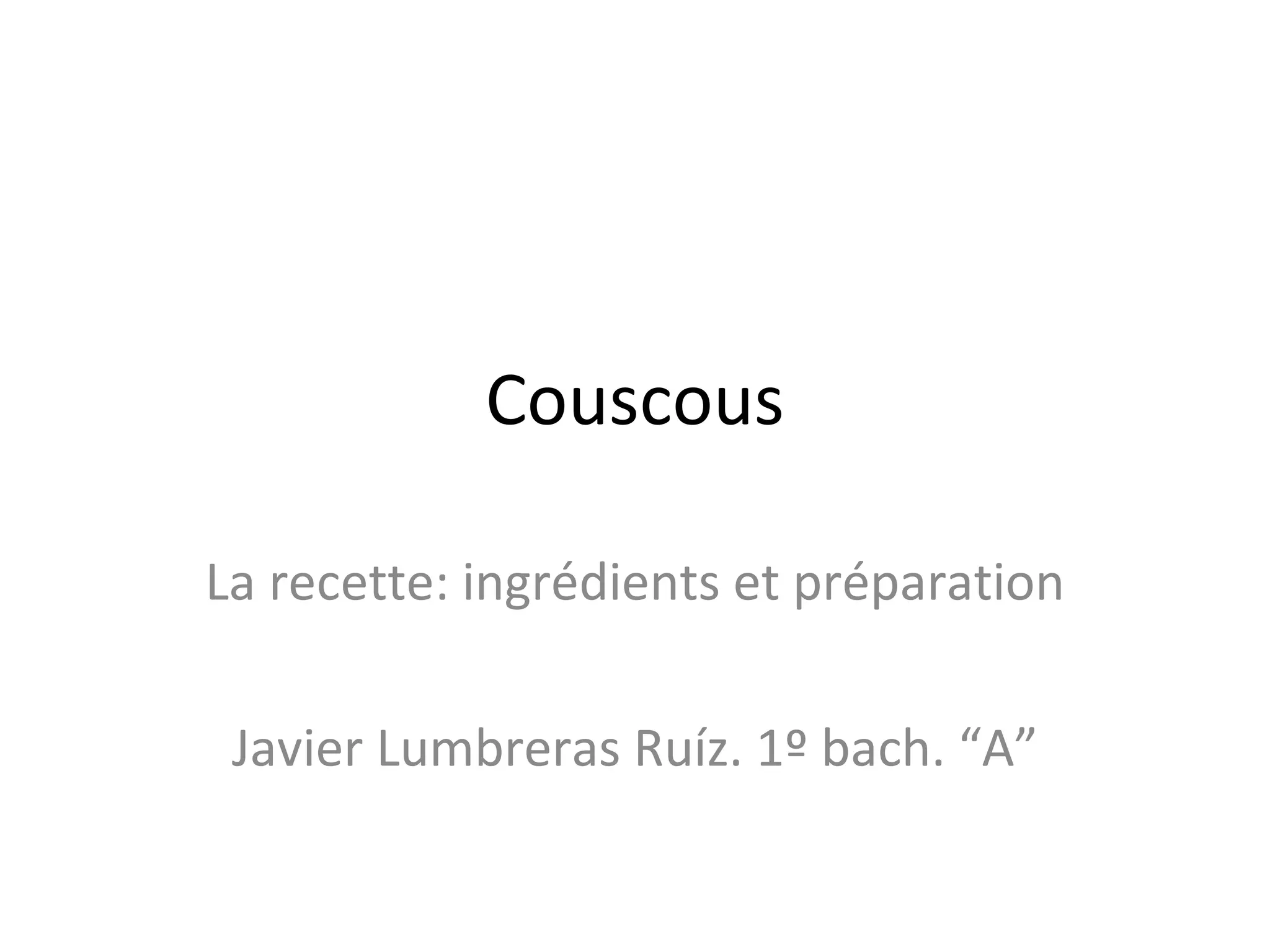 La recette de couscous proposée par Javier Lumbreras Ruíz détaille la préparation des légumes, de la viande de bœuf et de la semoule, suivie de la cuisson à la vapeur. Les ingrédients comprennent divers légumes, des épices, et de l'huile d'olive, le tout préparé en environ 2 heures 45 minutes. Le plat final est présenté avec la semoule, la viande et les légumes disposés de manière esthétique.