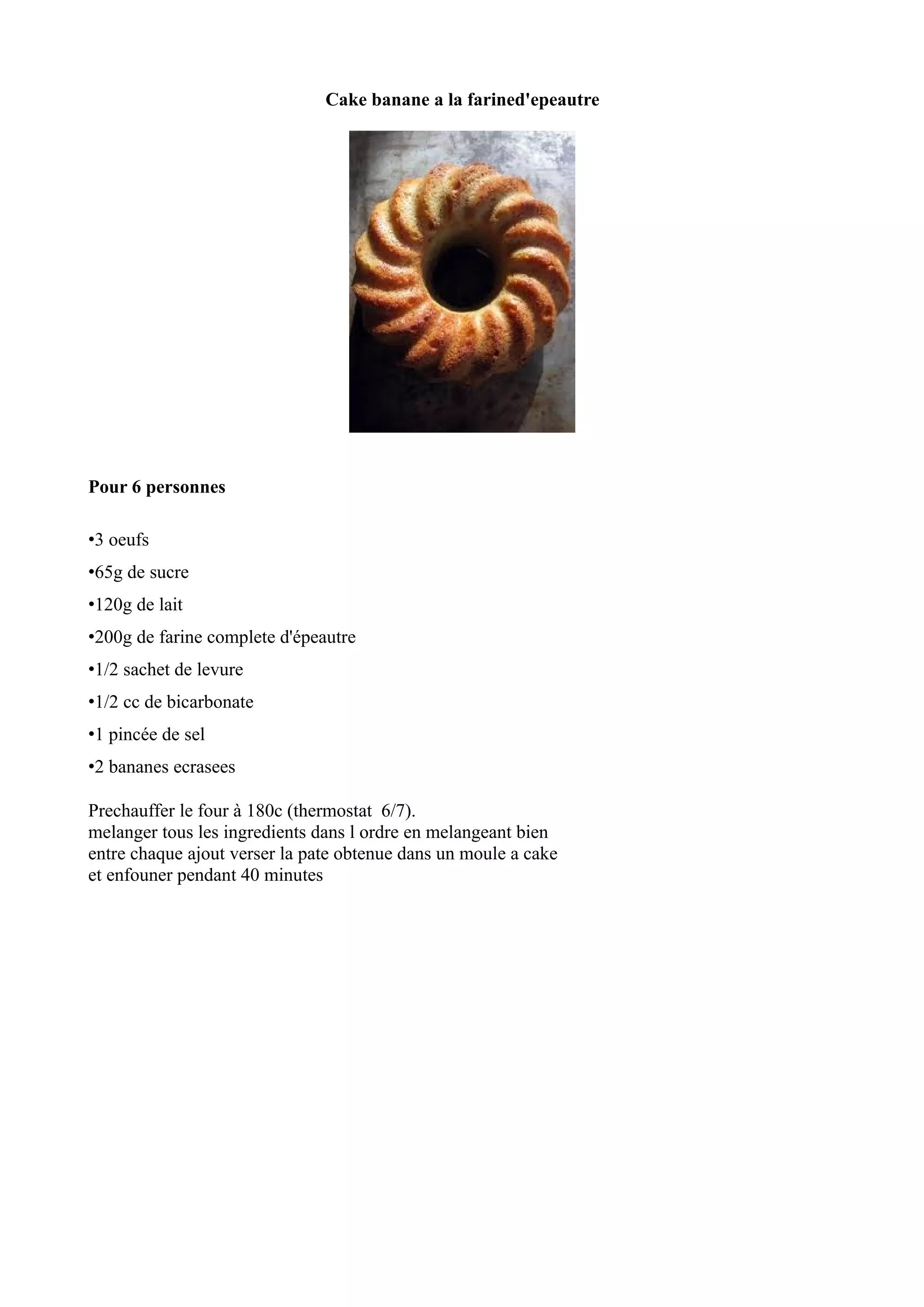 Cette recette propose un gâteau à la banane fait avec de la farine complète d'épeautre, destiné à 6 personnes. Les ingrédients comprennent des œufs, du sucre, du lait, de la farine d'épeautre, de la levure, du bicarbonate, du sel et des bananes écrasées. La préparation consiste à mélanger les ingrédients dans un certain ordre, puis à cuire le tout au four à 180°C pendant 40 minutes.