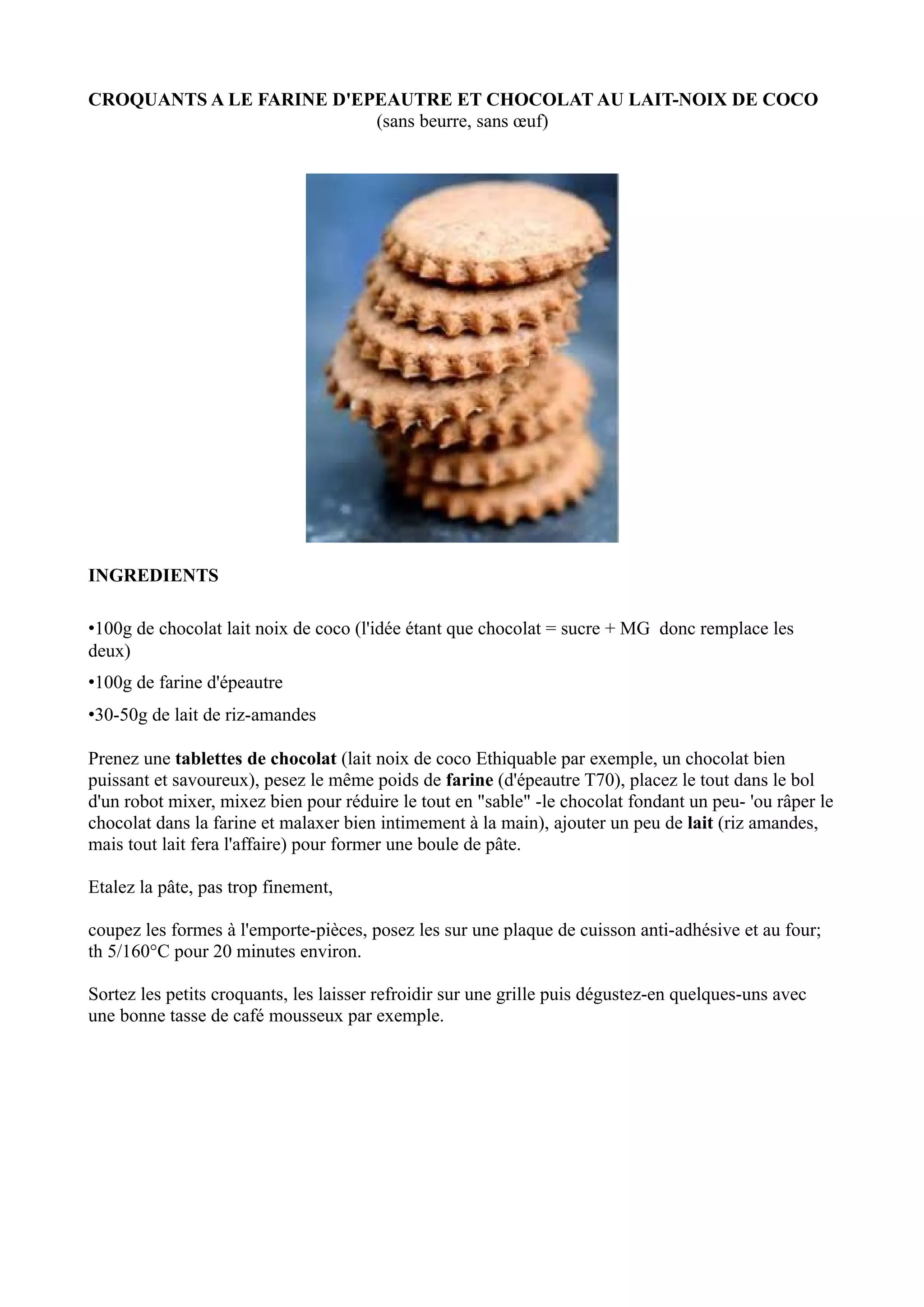 Le document présente une recette de croquants à base de farine d'épeautre et de chocolat au lait noix de coco, sans beurre ni œuf. Les ingrédients incluent 100g de chocolat, 100g de farine d'épeautre et 30-50g de lait de riz-amandes. La préparation consiste à mixer les ingrédients, former une pâte, découper des formes et les cuire au four pendant environ 20 minutes.