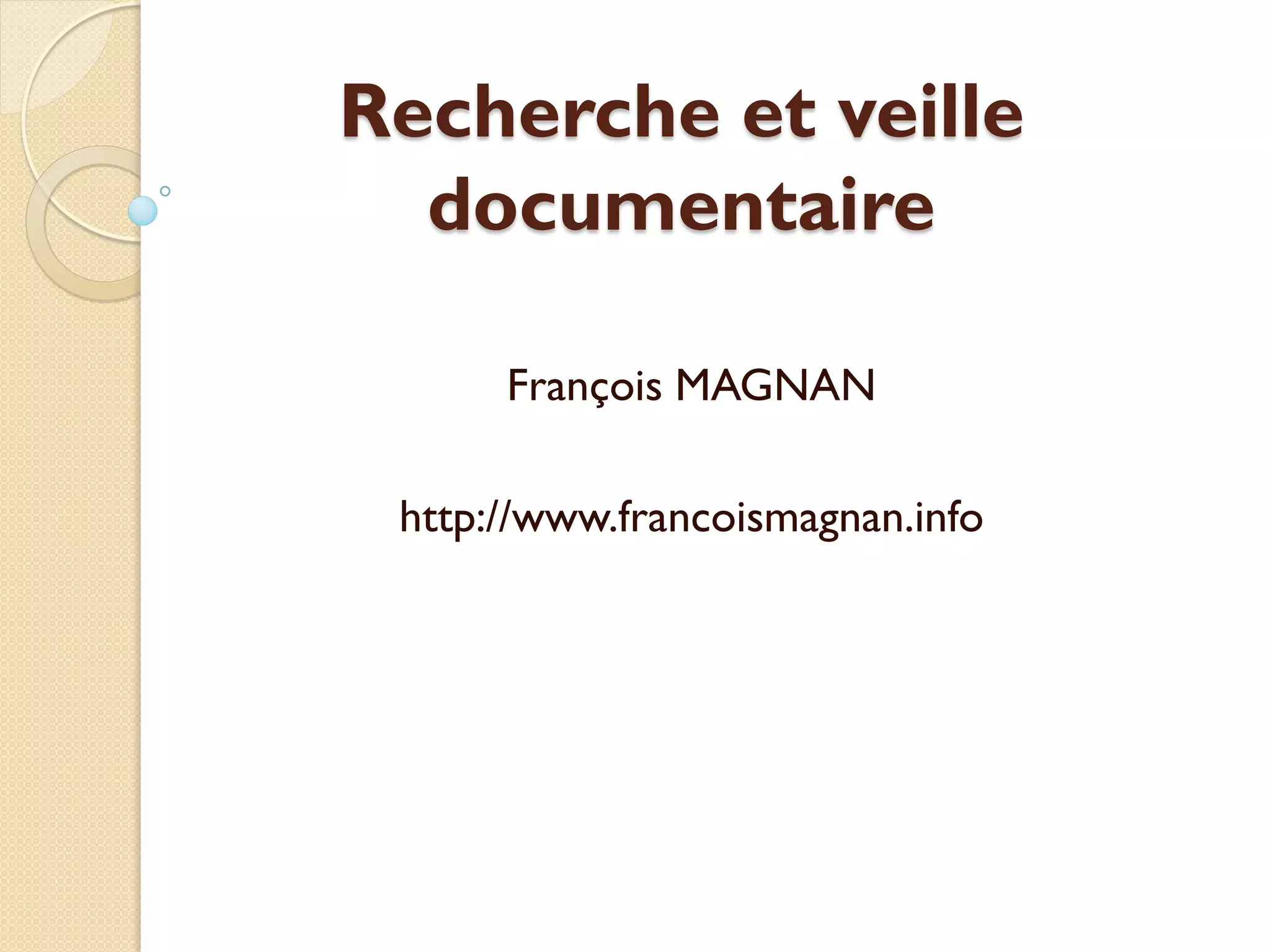 Le document aborde la recherche et la veille documentaire, en précisant leurs objectifs tels que la recherche d'informations, la veille continue et l'évaluation critique des sources. Il présente des méthodes variées dont les approches 'pull' et 'push', ainsi que des outils de capitalisation et de partage comme Mindmap, Scrapbook et Evernote. Des phases de travail sont détaillées, incluant l'établissement de termes de recherche et la sélection des sources, tout en soulignant les contraintes et avantages des différentes méthodes.