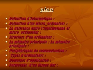 Le document explique l'informatique et les micro-ordinateurs, en abordant leur définition, leur évolution historique et leur structure. Il détaille également les mémoires, les périphériques de communication, les types d'ordinateurs et les domaines d'application de l'informatique. Enfin, il mentionne le formatage d'un disque dur comme une opération importante dans la gestion des données.