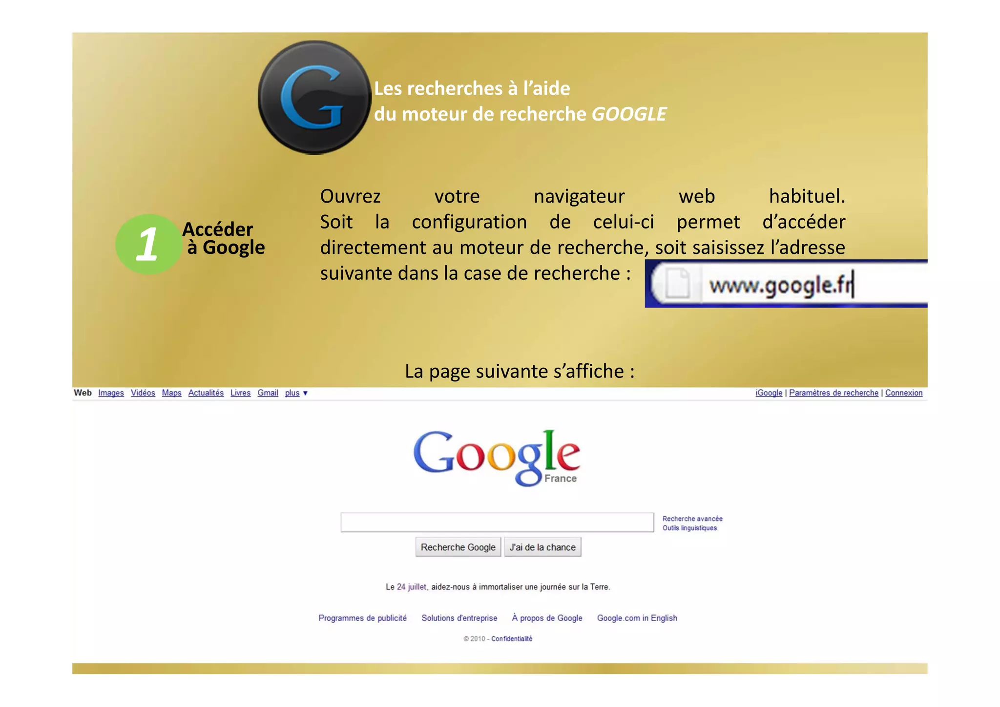 Le document décrit les étapes pour effectuer des recherches sur Google, y compris comment accéder à la page d'accueil, configurer les paramètres de recherche et lancer une recherche. Il présente également la page de résultats, les options de filtrage et la recherche avancée. Enfin, il mentionne d'autres moteurs de recherche spécialisés en dehors de Google.