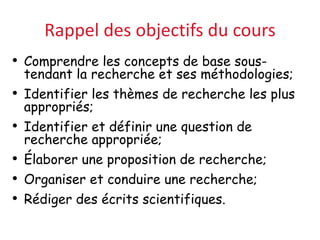 Ce document aborde les méthodologies de recherche, en précisant les concepts fondamentaux et les différentes étapes de la recherche, allant de la formulation d'une question à l'analyse des données et la rédaction de résultats. Il distingue également plusieurs types de recherche, y compris historique, descriptive, corrélationnelle et expérimentale, mettant l'accent sur le raisonnement inductif et déductif comme bases de la méthode scientifique. L'objectif final est de contribuer à l'avancement des connaissances et à la solution de problèmes pratiques.