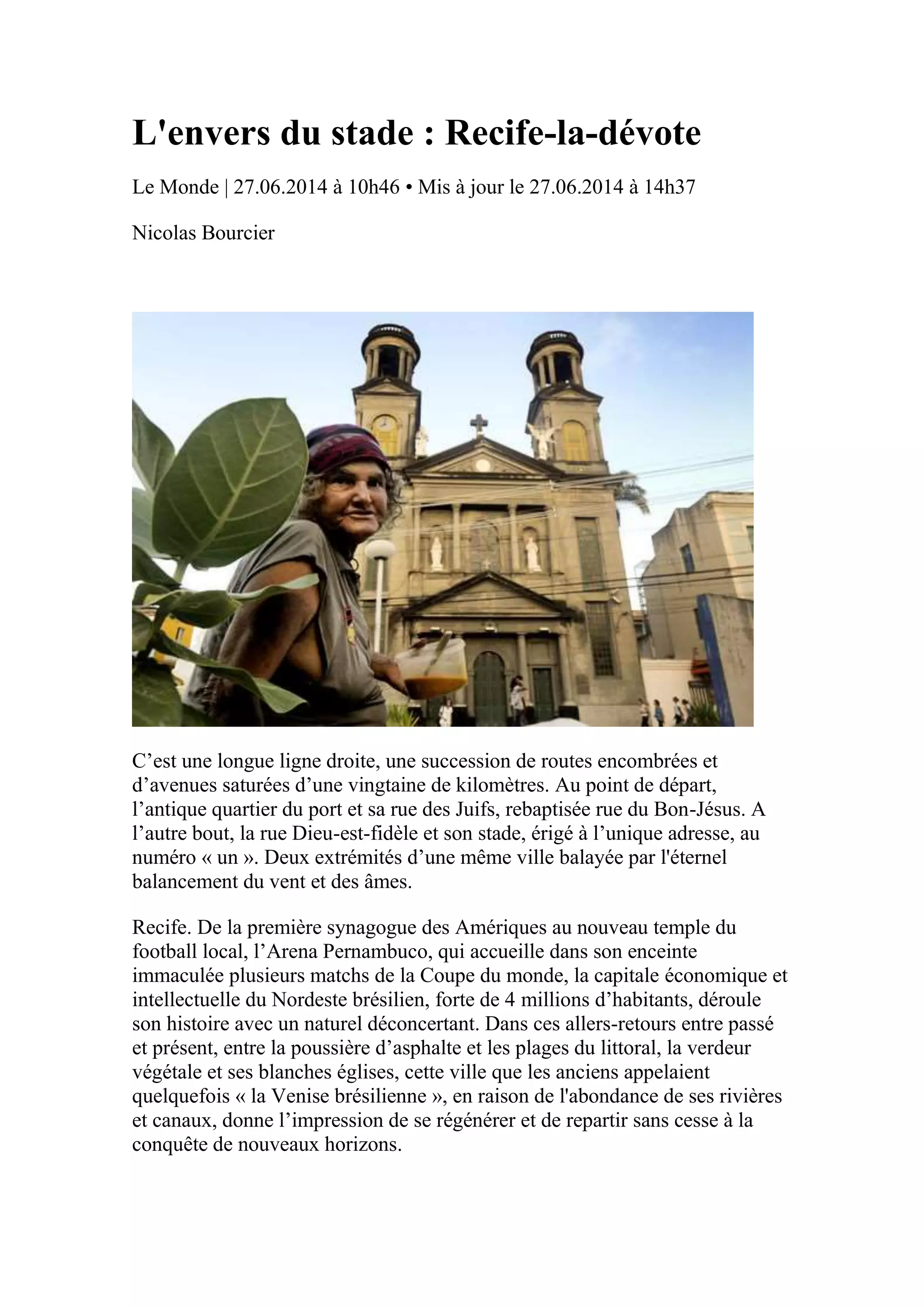 Le document explore l'histoire et la mixité religieuse de Recife, une ville brésilienne, en passant de son passé colonial à son rôle en tant que capitale culturelle et économique du Nordeste. Recife abrite une diversité de croyances, incluant un mélange de catholicisme, d'évangélisme et de religions afro-brésiliennes, illustrant un riche creuset culturel. L'urbanisation recentrée autour du nouveau stade, symbolisant à la fois des défis et des opportunités, révèle les dynamiques sociales et économiques de cette ville en évolution.