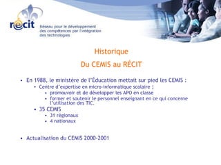 Le document présente le réseau pour le développement des compétences des élèves par l'intégration des TIC, en mettant en avant le rôle des CEMIS et du Récit dans l'éducation au Québec. Il détaille les services offerts, les domaines d'apprentissage, et les diverses initiatives de formation et de partage d'expertise pour les enseignants. Enfin, il souligne l'importance de la concertation et de la coordination au sein des différents acteurs impliqués.