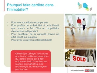 Royal LePage propose une carrière dans l'immobilier offrant flexibilité, ressources, et potentiel de revenu illimité, tout en aidant les autres grâce à la Fondation Un Toit Pour Tous. L'entreprise se distingue par sa culture de collaboration et des outils technologiques avancés, et mise sur un marketing puissant pour accroître sa notoriété. Avec un large réseau national et international, les agents peuvent bâtir leur clientèle et atteindre leurs objectifs professionnels.