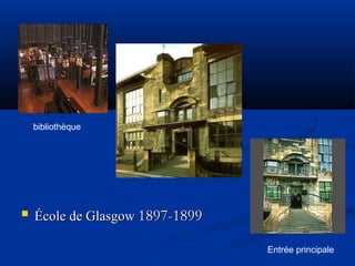 Le document présente plusieurs figures clés du mouvement art nouveau et du futurisme, notamment Charles Rennie Mackintosh, Otto Wagner, et Josef Maria Olbrich, en détaillant leurs contributions et réalisations architecturales. Il évoque également Filippo Marinetti et son influence sur la peinture futuriste, qui célèbre la vitesse et le dynamisme modernes. Le document souligne l'impact limité mais significatif du futurisme en architecture avec des réalisations emblématiques comme le Palais Stoclet de J. Hoffmann.