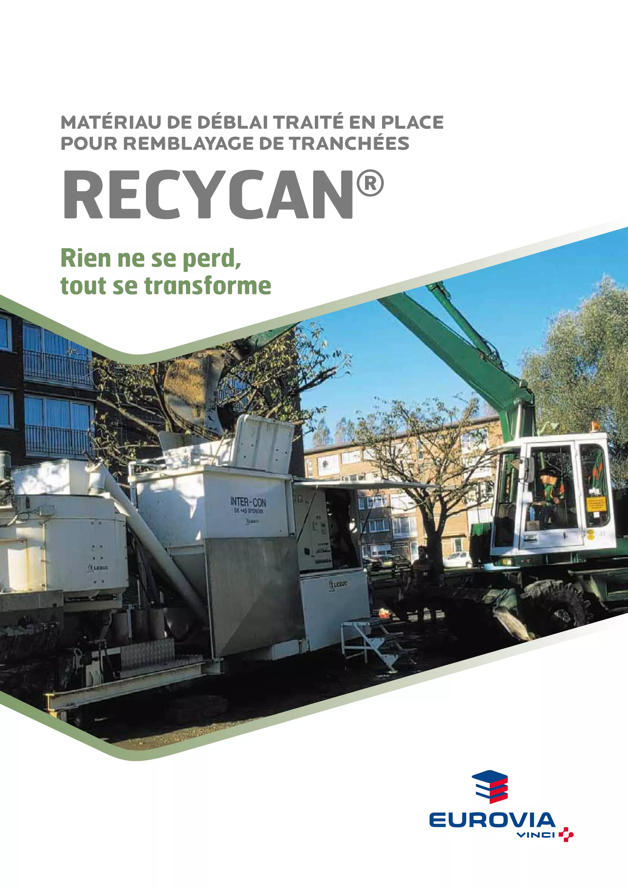 Recycan® est un matériau de déblai traité sur place pour le remblayage de tranchées, offrant une solution durable en transformant des déblais de basse qualité en matériaux réutilisables. Il permet une réduction significative des nuisances liées aux chantiers, un réemploi rapide, et limite les transports de matériaux, tout en obtenant une remise en circulation rapide. Développé pour s'inscrire dans une démarche de développement durable, Recycan® constitue une alternative écologique efficace, améliorant la qualité des remblayages tout en étant excavable.